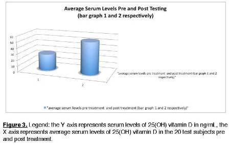 After the eight-week supplemental period the average 25(OH) vitamin D blood level was 54 ng/mL, a 106 percent average increase. Post supplementation 15-study subjects, or 75 percent, had serum levels more than the deficiency blood level of 32 ng/mL (pre-supplementation 75 percent were deficient).