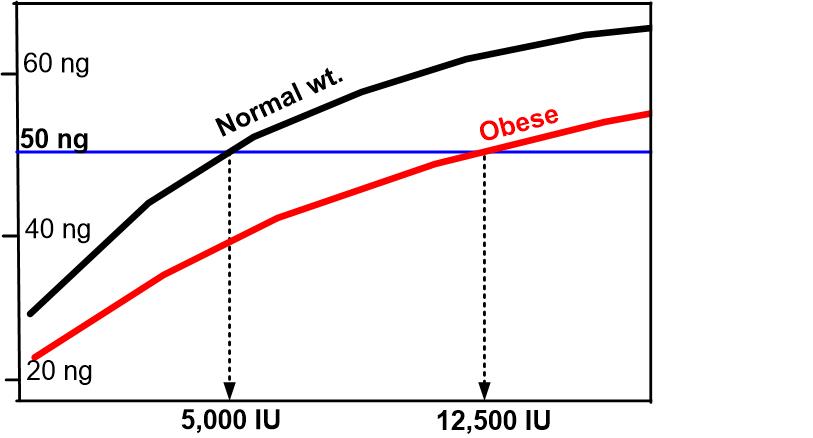 Obese need more Vitamin D: Volume dilution, IU per pound, or BMI – RCT Dec 2012 has the following chart