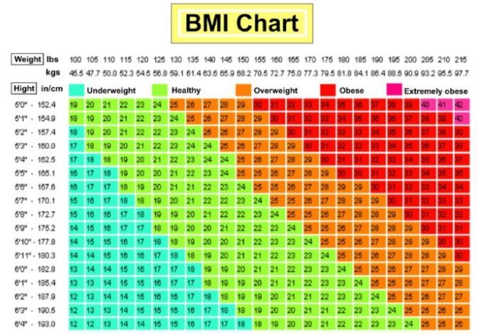 BMI = ( Weight in Pounds / ( Height in inches x Height in inches ) ) x 703
