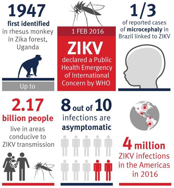 Zika virus (ZIKV) infection was previously considered to be of modest public health concern, causing only mild fever, rash, and arthralgia in 20 % of patients, with 80 % of infections being asymptomatic [1]. Recently, ZIKV has caused large outbreaks in the Pacific (especially in the island of Yap in 2007 and in French Polynesia in 2012-14). The subsequent major outbreaks in Central and South America (especially Brazil) in 2015-16 led to the World Health Organization (WHO) declaring the situation as a Public Health Emergency of International Concern, placing it on the same priority list as the recent Ebola virus outbreak (Fig. 1). Increase in research efforts has led to ZIKV now being an accepted cause of the major increase in neurological abnormalities, including microcephaly and Guillain-Barre syndrome, reported in these regions.