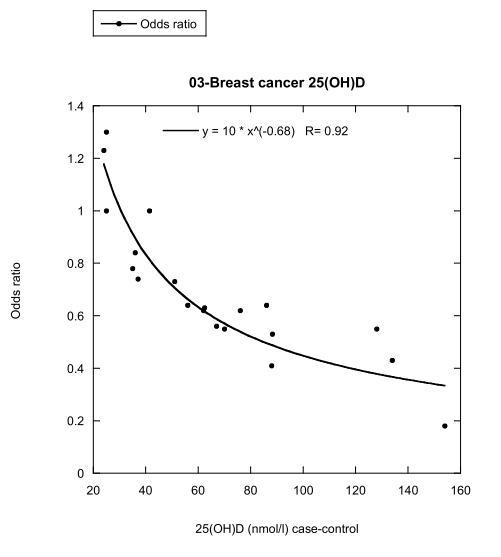 The 13 types of cancer with the strongest evidence - based on number of studies reporting strong inverse correlations - are bladder, female breast, colon, esophageal, gallbladder, gastric, ovarian, pancreatic, prostate, rectal, and renal cancer, as well as lymphoma (Hodgkin's and non-Hodgkin's). Case-control studies of breast and colorectal cancer incidence find pronounced inverse correlations with serum 25-hydroxyvitamin D [25(OH)D] concentrations, with rapid reductions in risk for increases of 25(OH)D concentration at low values and little change above about 100 nmol/l.