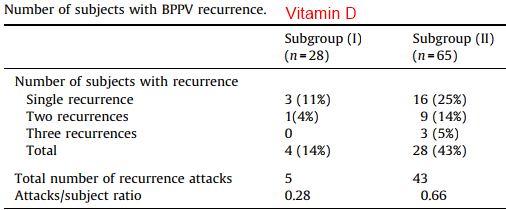 The mean values for recurrent attacks/subject in subgroups (I) & (II) were 0.18, and 0.66 attack/subject respectively; these differences between both subgroups were of high statistical significance (p < 0.01). The Odds Ratio for development of recurrence of BPPV in subjects with severe vitamin D deficiency was 4.54 (95% CI: 1.41–14.58, p < 0.01). The relapse attacks of BPPV affected both ears irrespective of the ear showing the original BPPV attack.Conclusion: The present study indicates that improvement of serum 25-hydroxyvitamin D3 levels is associated with substantial decrease in recurrence of BPPV.