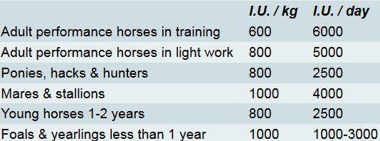 Fresh hay for horses was found to have 2,000 IU per kilogram (in one year the vitamin D content of the hay will fall by 70%)