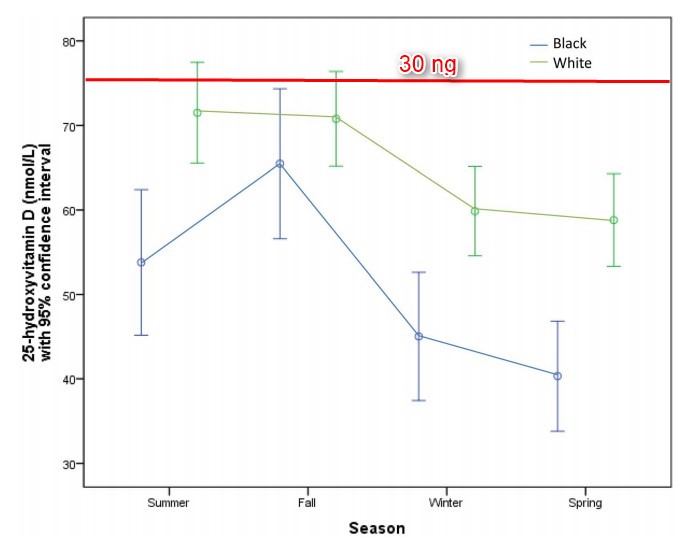 Serum 25(OH)D levels peaked in summer and autumn, and decreased in winter and spring. Vitamin D deficiency occurred in 50.5% of blacks, 29.3% of whites, and 14.3% of Asian inmates (p=0.007). Black inmates had significantly lower serum 25(OH)D level than white inmates at the maximum security level (p=0.015), medium security level (p=0.001), but not at the minimum security level (p=0.40). After adjusting for covariates black inmates at a maximum security level had a four-fold higher risk for vitamin D deficiency than white inmates at the same security level (OR 3.9 [95% CI 1.3-11.7].