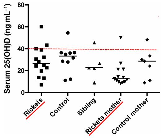 Vitamin D deficiency is associated with adverse health outcomes, including impaired bone growth, gingival inflammation and increased risk for autoimmune disease, but the relationship between vitamin D deficiency rickets in childhood and long-term health has not been studied. In this study, we assessed the effect of early vitamin D deficiency on growth, bone density, dental health and immune function in later childhood to determine if children previously diagnosed with rickets were at greater risk of adverse health outcomes compared with healthy children. We measured serum 25-hydroxyvitamin D, calcium, parathyroid hormone, bone mineral density, anthropometric measures, dietary habits, dental health, general health history, and markers of inflammation in 14 previously diagnosed rickets case children at Children's Hospital Oakland Research Center. We compared the findings in the rickets cases with 11 healthy children selected from the population of CHO staff families. Fourteen mothers of the rickets cases, five siblings of the rickets cases, and seven mothers of healthy children also participated.