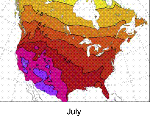 - Map of minutes of sun to get 106 joules in July from: UV in North America with many maps