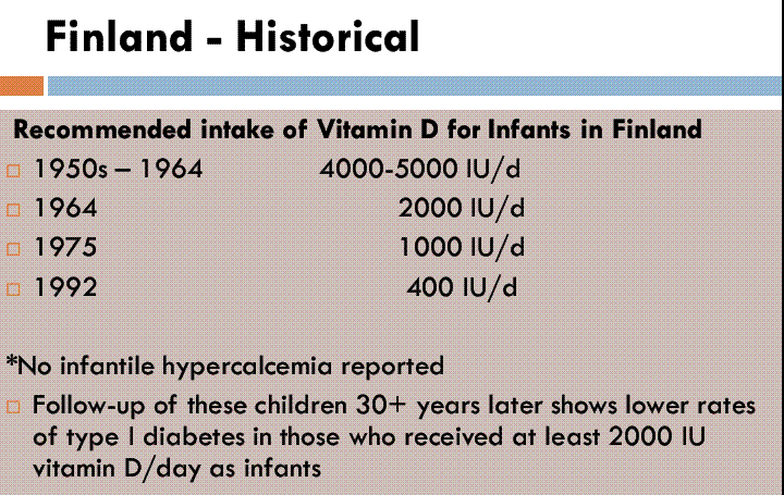 Suspect that within a few years the liability situation will be reversed, that is, the doctor will be INCREASE his liability when he FAILS to recommend vitamin D - 1950's-1964 Finnish children got 4000+ IU chart